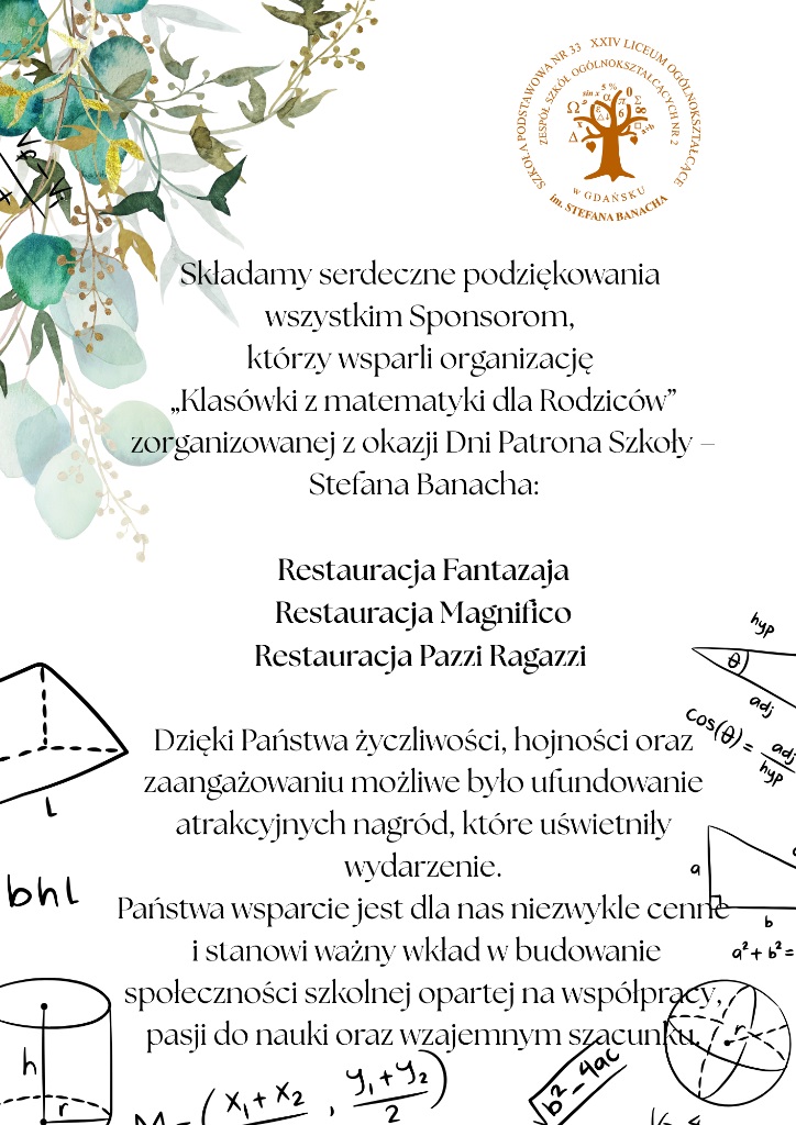Z okazji Święta Patrona Szkoły – Stefana Banacha – została zorganizowana Klasówka Matematyczna dla Rodziców. Cieszymy się, że wydarzenie spotkało się z dużym zainteresowaniem i zaangażowaniem ze strony Państwa. Takie inicjatywy są dla nas niezwykle ważne, ponieważ budują wspólnotę szkolną i promują wartość nauki.