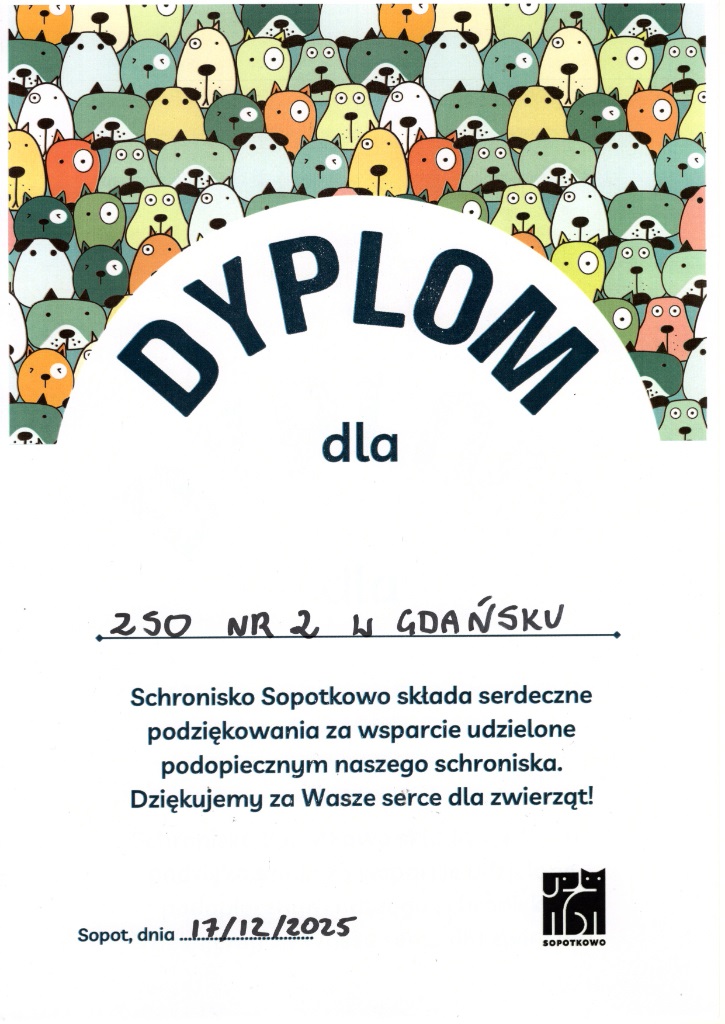 Dziękujemy wszystkim, którzy tak licznie i aktywnie włączyli się w tegoroczną akcję szkolną "Mikołaj dla zwierząt".Podczas kiermaszu ciast zebraliśmy imponującą kwotę 1977,30 zł, którą przekazaliśmy na potrzeby zwierząt ze schroniska Staruszkowo.Zebraną karmę przekazaliśmy schronisku Sopotkowo w Sopocie.Bardzo dziękujemy!Klasa 7d wraz z wychwawcą Wioletą Seń