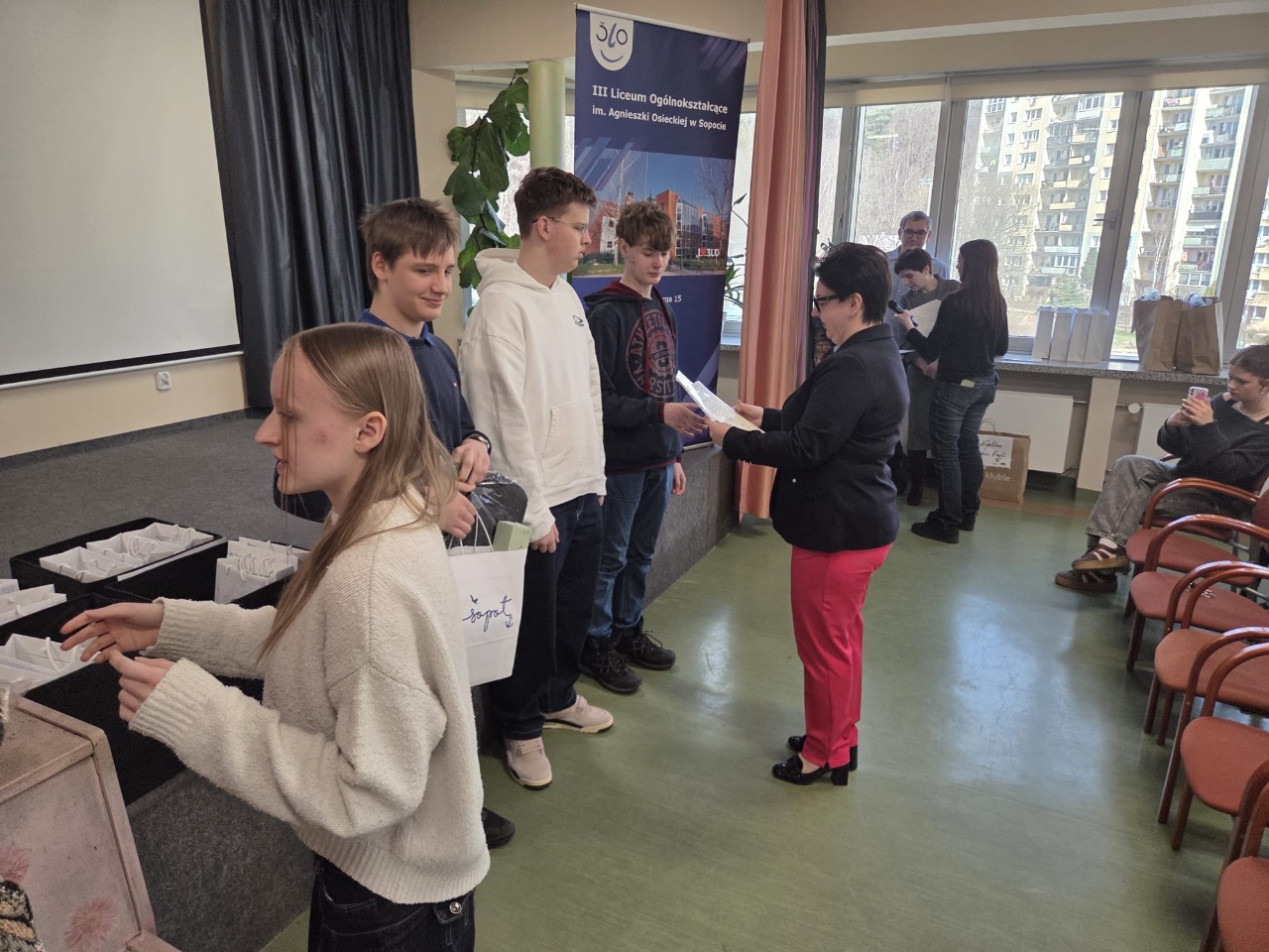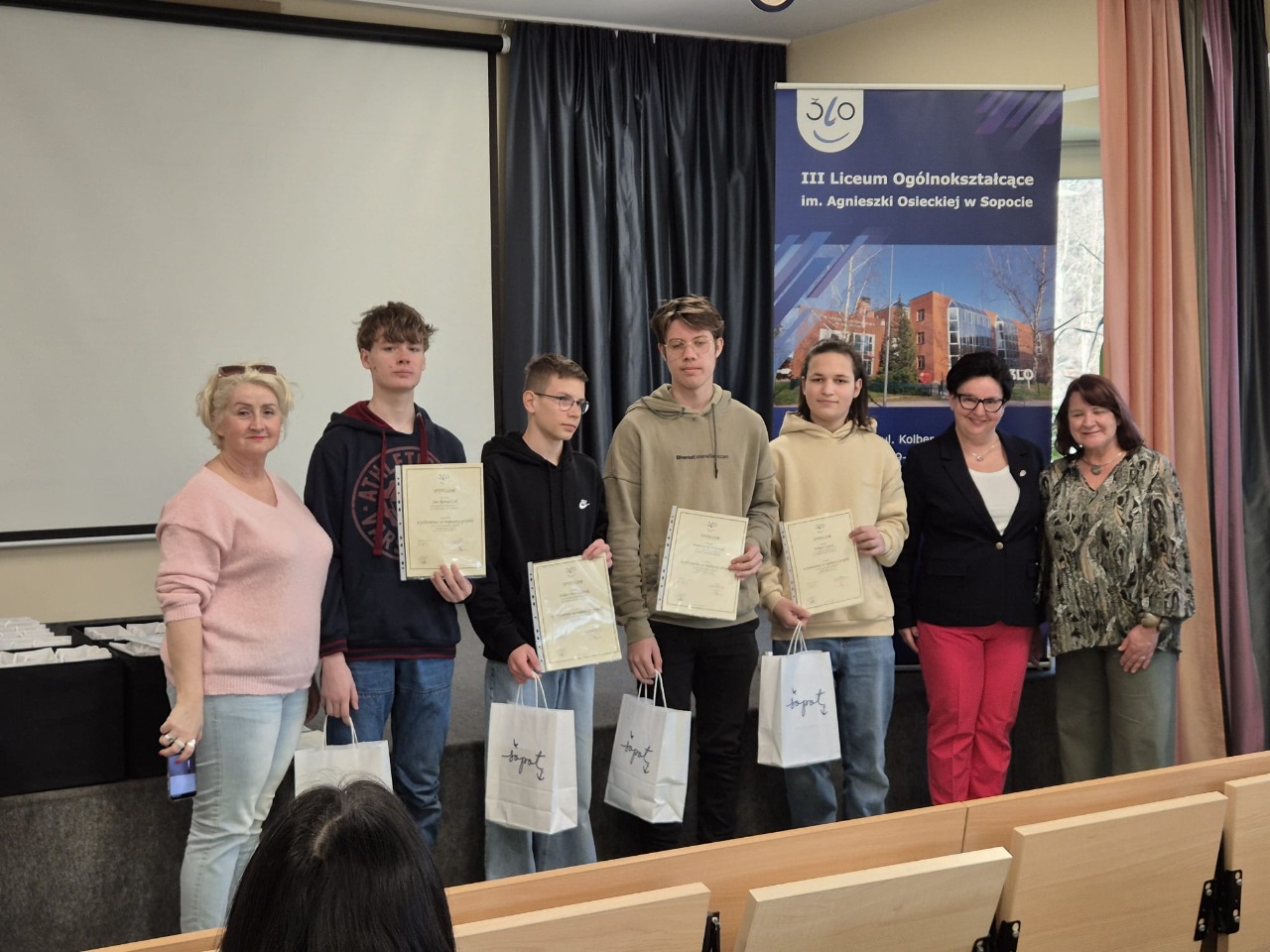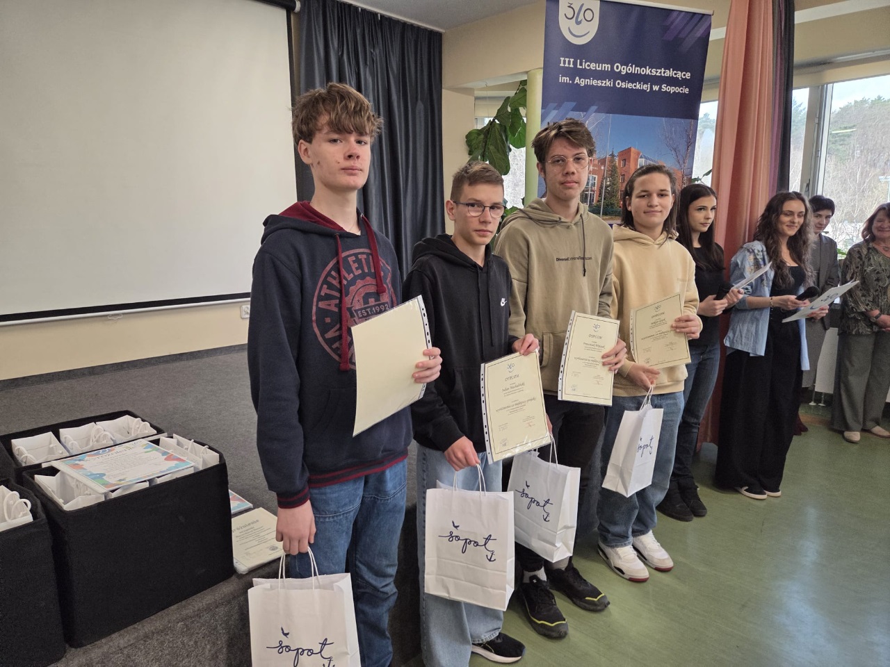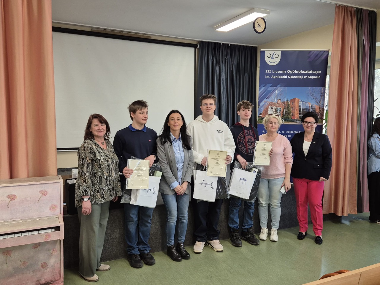 Nasza drużyna z klasy 8b w składzie: Jan Rampczyk, Wiktor Gajek, Julian Machaliński i Franciszek Wojczak (nauczyciel fizyki Iwona Zielińska) uczestniczyła w konkursie organizowanym przez III LO w Sopocie. Konkurs polegał na wykonaniu pracy, która pokazuje iluzje optyczne oraz napisaniu testu matematyczno-fizycznego. Chłopaki wykonali beczkę w taki sposób, że patrząc w beczkę widzieliśmy niekończący się tunel. Otrzymaliśmy wyróżnienie jako grupa a nasz kolega Jan Rampczyk I miejsce ponieważ oprócz pracy znakomicie napisał test.