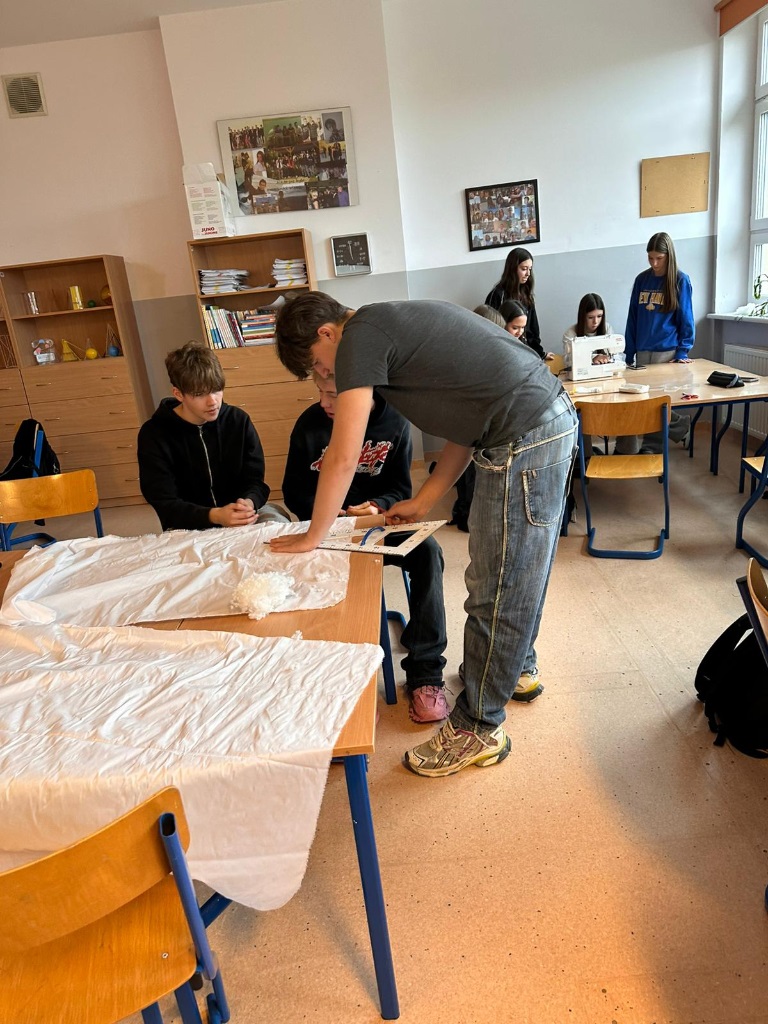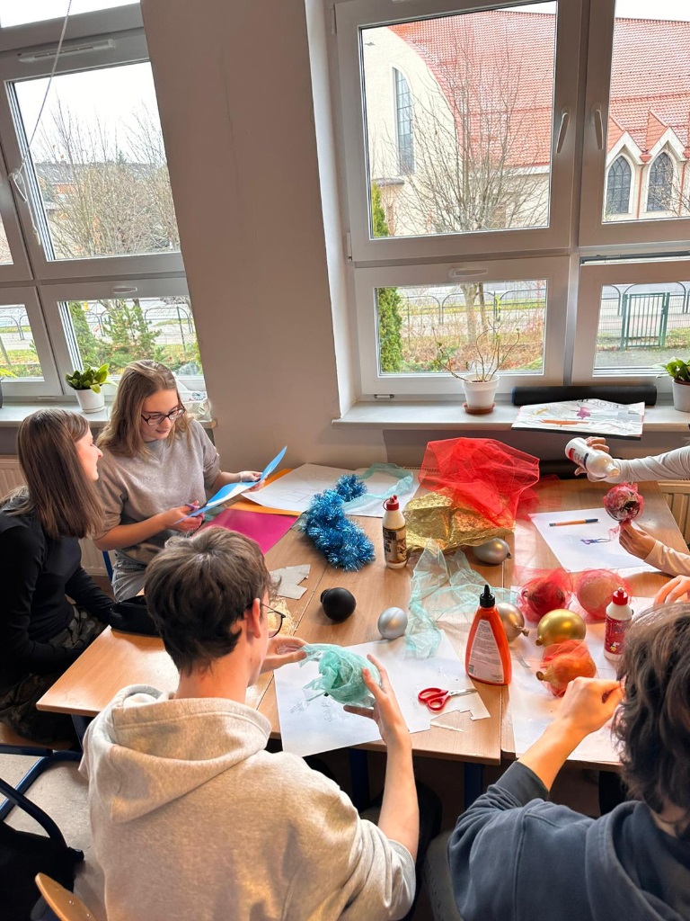 Podczas zajęć uczniowie z zaangażowaniem tworzyli dekoracje, wykorzystując m.in. zużyte kartony, kolorowy papier, wstążki, wełnę oraz inne materiały, którym nadali drugie życie. Powstały wyjątkowe, ekologiczne ozdoby, które nie tylko wprowadzą świąteczny nastrój, ale także pokażą naszym partnerom, jak ważne jest dbanie o planetę.